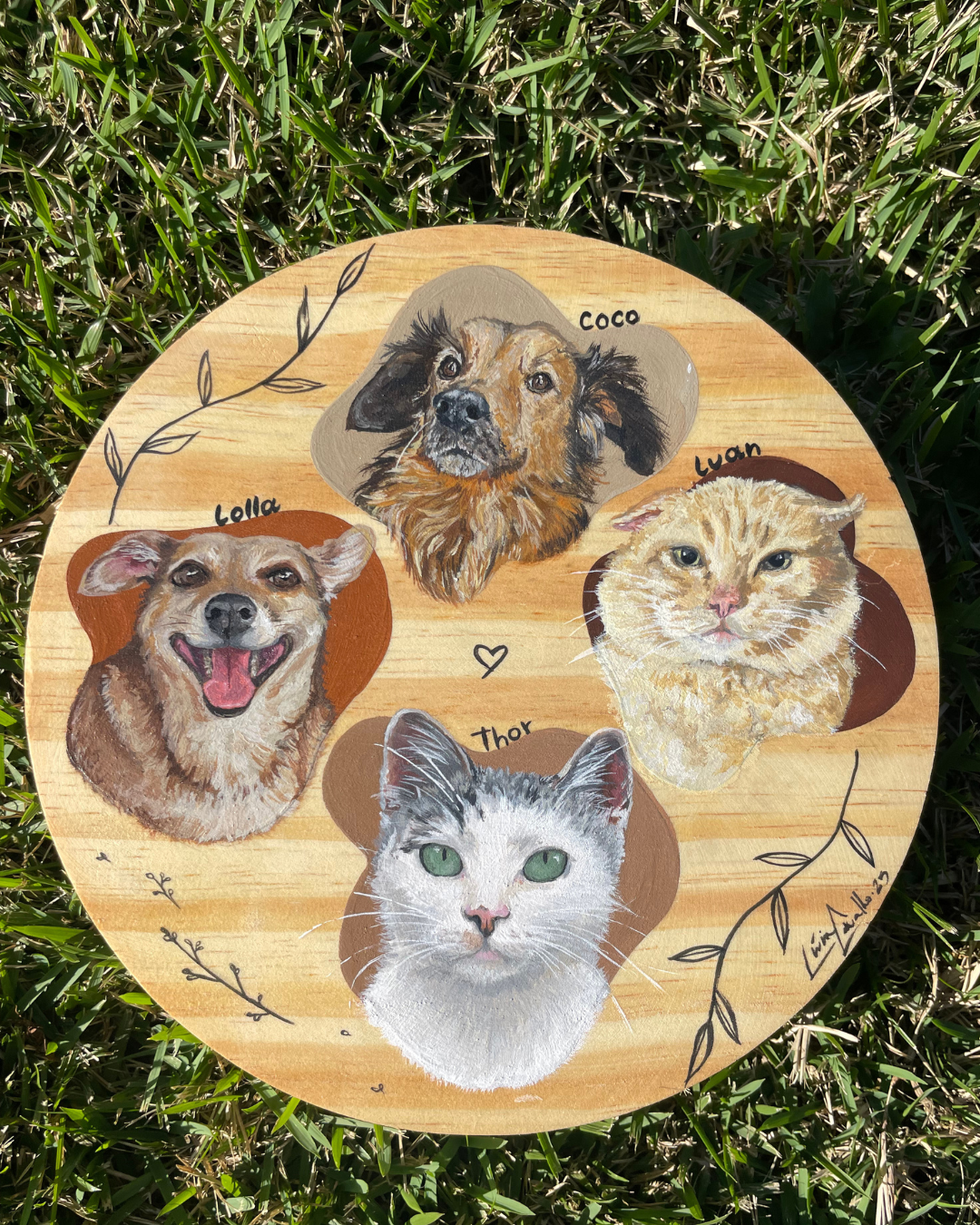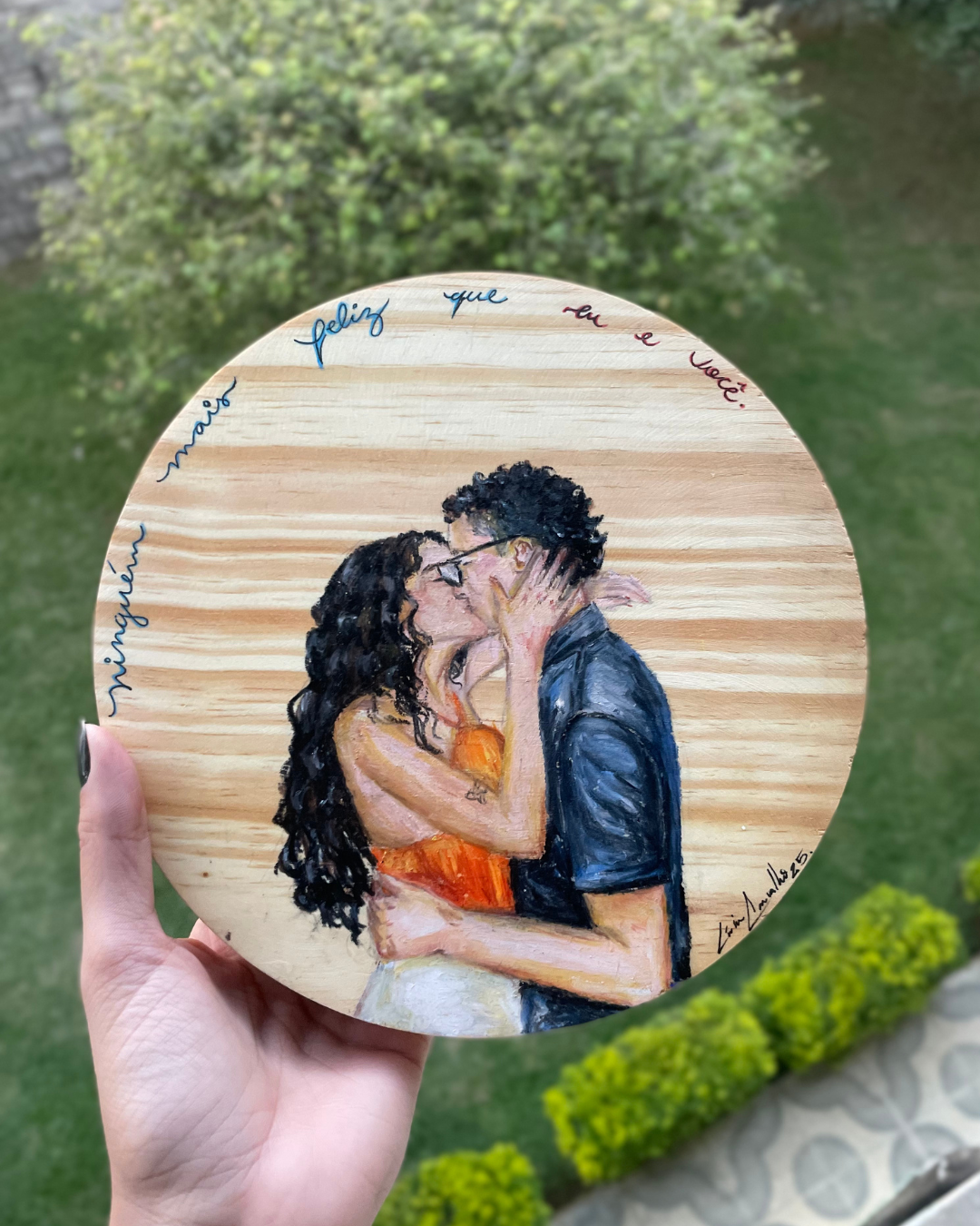 Você escolhe a base — madeira, papel, tela e até parede (sim, faço murais e posso ir até a sua casa dar vida a sua ideia). Defina também o material: tintas, giz, lápis e muito mais. O tamanho é totalmente personalizável, e o tema… é o que você quiser! A arte é sua, feita para ser única.